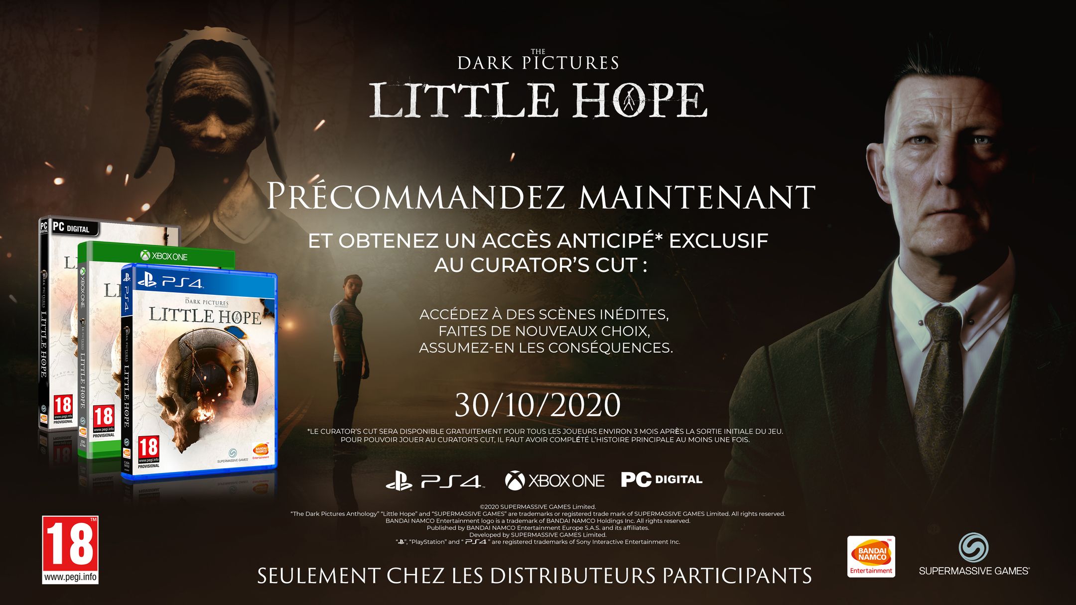 - L’édition Collector comprend le jeu Little Hope, une carte du monde de l’anthologie The Dark Pictures, deux pins exclusifs et une réplique de la poupée Mary de 1692. Cette édition est uniquement disponible sur la boutique en ligne de Bandai Namco Entertainment Europe